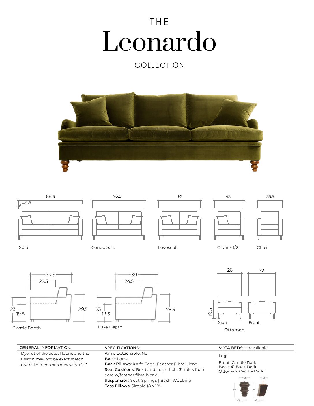 Choose between two luxurious feather filled depths to suit your lounging preference, whether you love sinking into a cozy embrace or prefer a more structured sit. Call or visit us in-store to place an order. Orders for custom made pieces cannot be placed online, only over the phone or in-person. 604-270-0880 Dimensions as priced: 88.5″ x 37.5″ (Classic Depth Specifications Variations Pricing Information: Please note that most items are final sale. If an item is approved for return, a minimum 25% restocking fee will be applied. Return shipping charges are the customer’s responsibility. If you would like more information about our return policy, please click here.Description